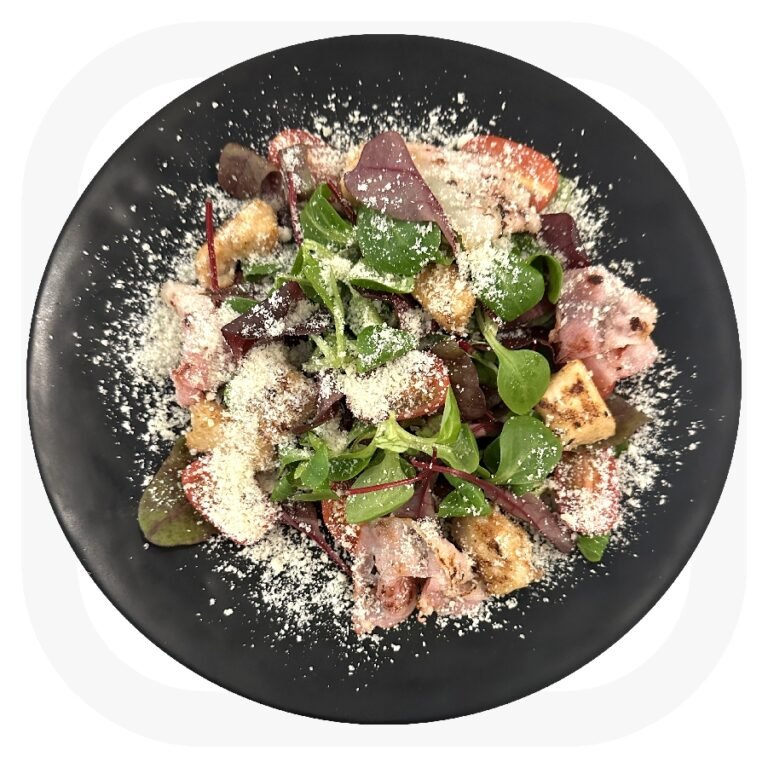 Mixed salad, avocado, cherry tomatoes, salmon, parmesan, lime, honey mustard sauce.