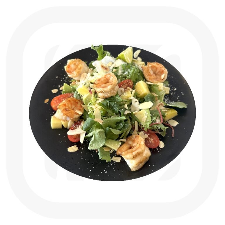 Mixed salad, cherry tomatoes, avocado, tiger prawns, mango, lime, soy sauce, honey mustard sauce.